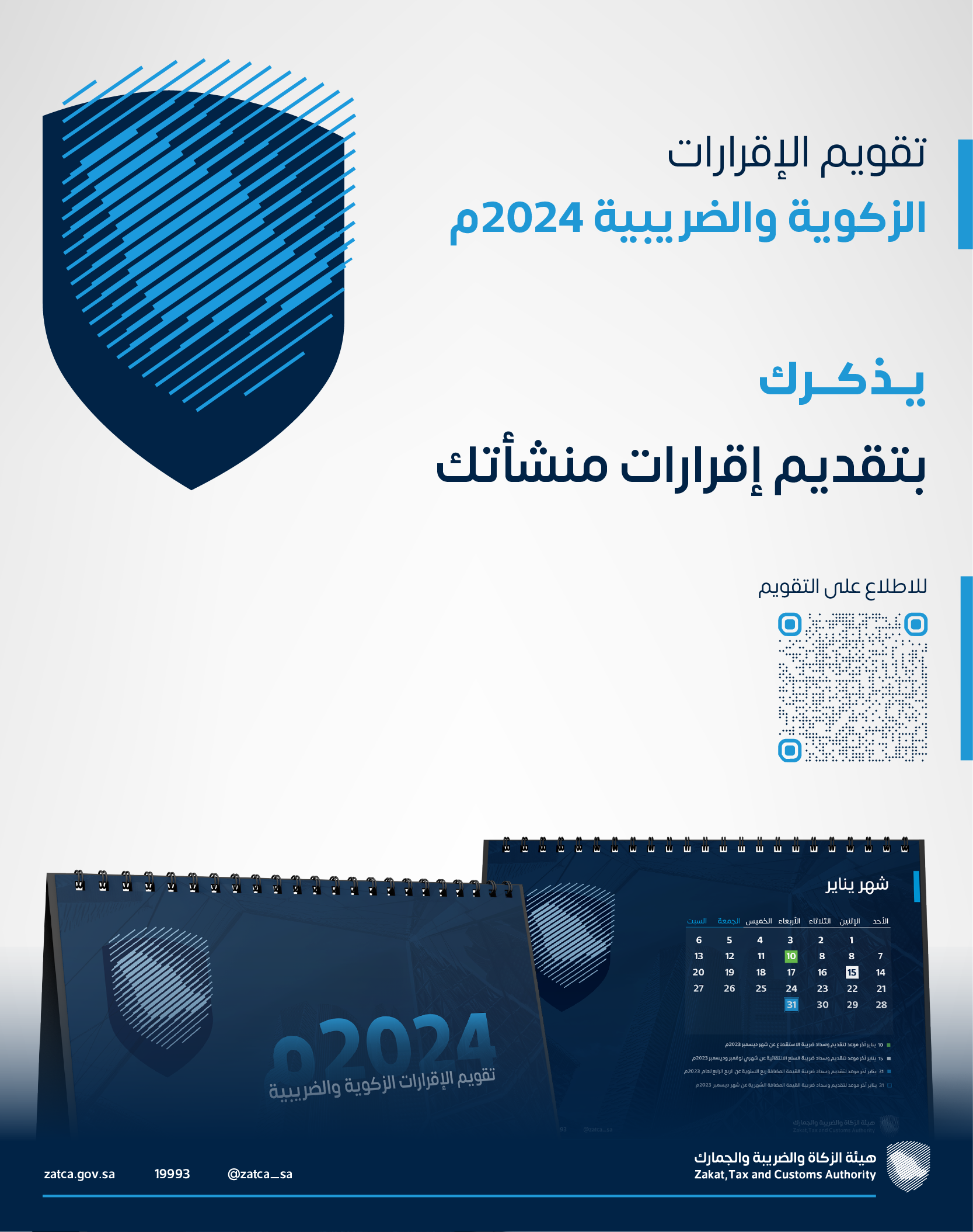 أصدرت هيئة الزكاة والضريبة والجمارك تقويمًا يوضح مواعيد الإقرارات الزكوية والضريبية لعام 2024م، وذلك بهدف تمكين المنشآت المكلفة من أداء واجباتهم الزكوية والضريبية في أوقاتها المحددة.