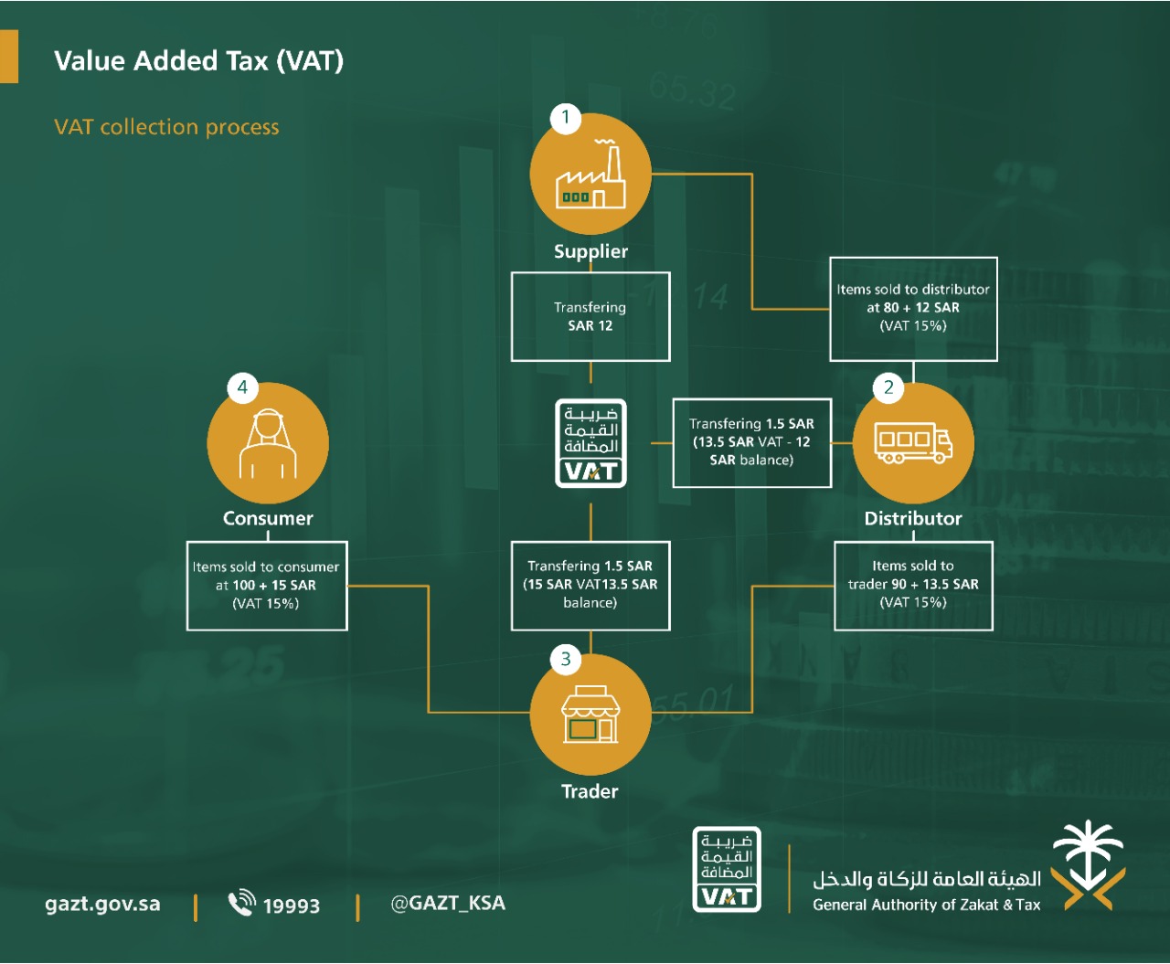 The consumer pays the VAT cost on purchased goods and services. Businesses pay the government the VAT collected from their customers’ purchases and refund the VAT they paid to their suppliers. In June 2016, the GCC countries agreed to impose VAT across the GCC region. In February 2017 (Jumada Al-Awwal 1438), Saudi Arabia ratified the GCC VAT framework and imposed VAT on January 1, 2018 (Rabi Al-Thani 14, 1439). VAT was introduced at a standard rate of 5%.