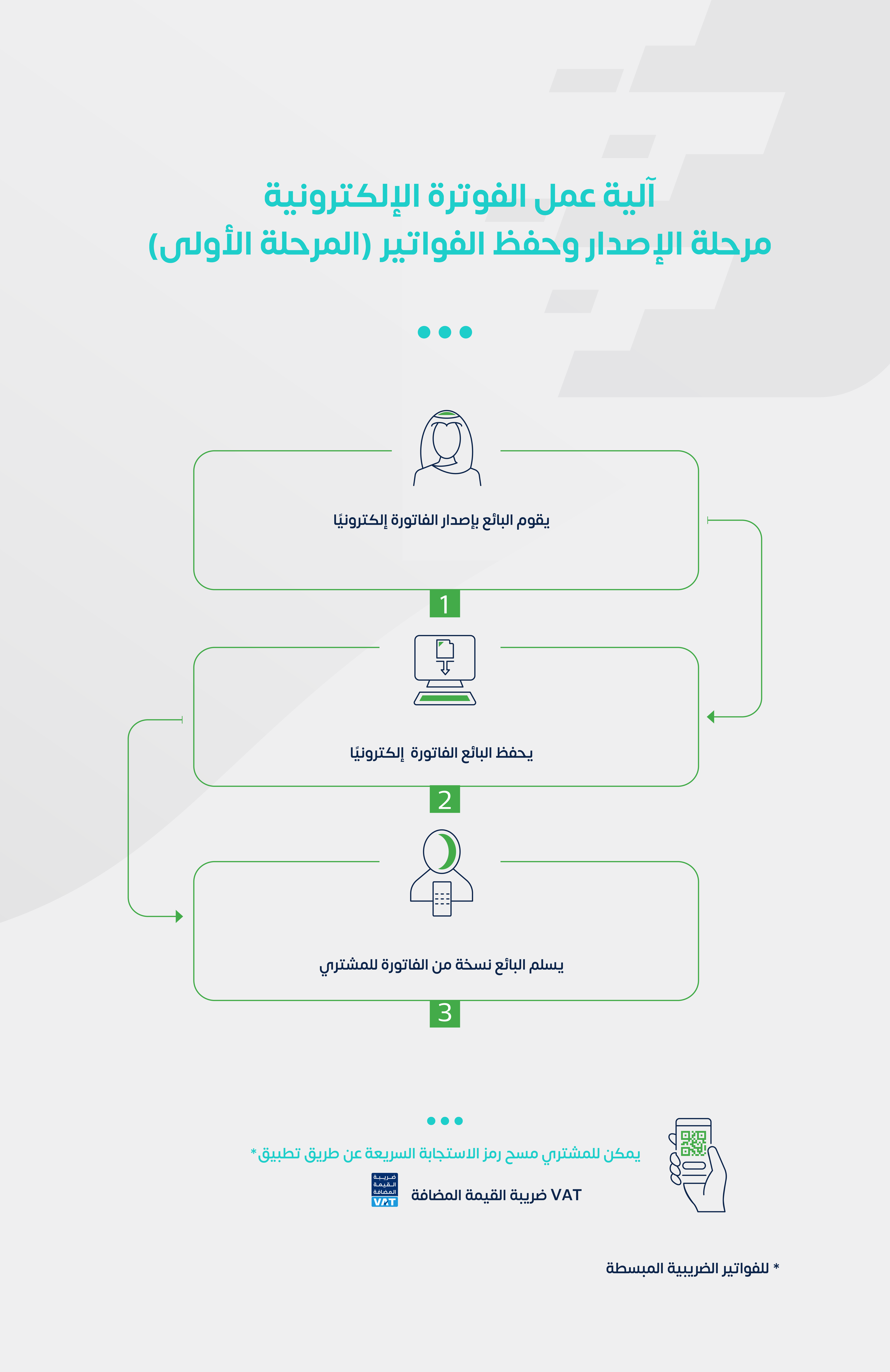 يتم تطبيق الفوترة الإلكترونية على مرحلتين، المرحلة الأولى "مرحلة الإصدار والحفظ" بدأت من 4 ديسمبر 2021م لكل الأشخاص الخاضعين للائحة الفوترة الإلكترونية ومن ينيب عن المكلف بإصدار الفاتورة. إصدار الفواتير الإلكترونية سيكون مماثل لإصدار الفواتير اليوم ولكن من خلال نظام فوترة إلكتروني متوافق وتكون الفاتورة متضمنة لكل العناصر المطلوبة بناءً على نوع الفاتورة.