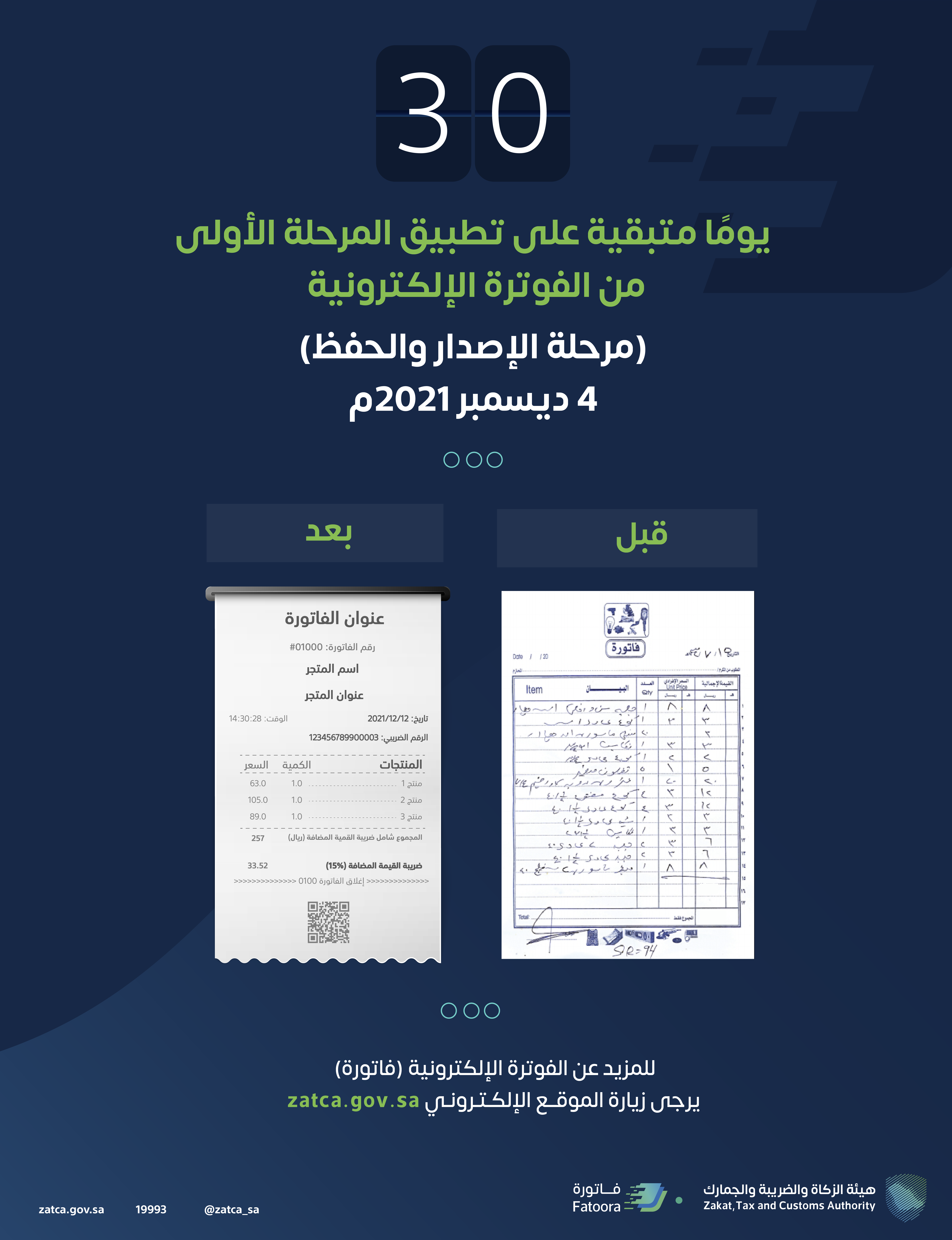 دعت هيئة الزكاة والضريبة والجمارك مكلفيها الخاضعين للائحة الفوترة الإلكترونية، إلى المسارعة في الاستعداد اللازم لتهيئة منشآتهم بمتطلبات المرحلة الأولى، والمتبقي عليها 30 يومًا، حيث ستدخل حيز التنفيذ في 4 ديسمبر 2021م.