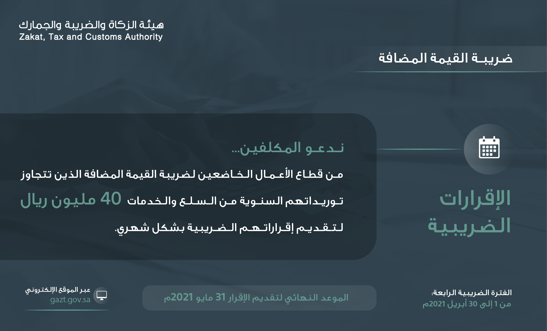 دعت هيئة الزكاة والضريبة والجمارك المكلفين من قطاع الأعمال الخاضعين لضريبة القيمة المضافة إلى تقديم إقراراتهم الضريبية عن شهر أبريل الماضي، وذلك في موعد أقصاه الحادي والثلاثين من شهر مايو الجاري.