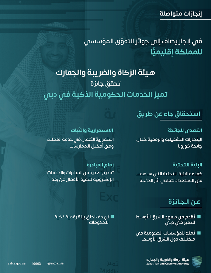 حصلت هيئة الزكاة والضريبة والجمارك على جائزة الشرق الأوسط الـ 27 لتميز الحكومة والمدن الذكية عن فئة الخدمات المؤسسية الحكومية الذكية، والمقدَمة من معهد الشرق الأوسط للتميز في دبي بدولة الإمارات العربية المتحدة، وذلك بعد منافسة شاركت فيها جهات حكومية من مختلف دول الشرق الأوسط.